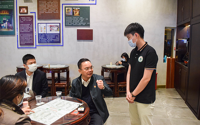 進店后分桌而坐,主動摘下口罩帶頭進行堂食消費,品嘗雙皮奶、姜撞奶等特色美食,以實際行動支持餐飲行業(yè)經(jīng)營發(fā)展,鼓勵市民放心消費。還積極詢問商家復工經(jīng)營情況,并現(xiàn)場協(xié)調(diào)解決。